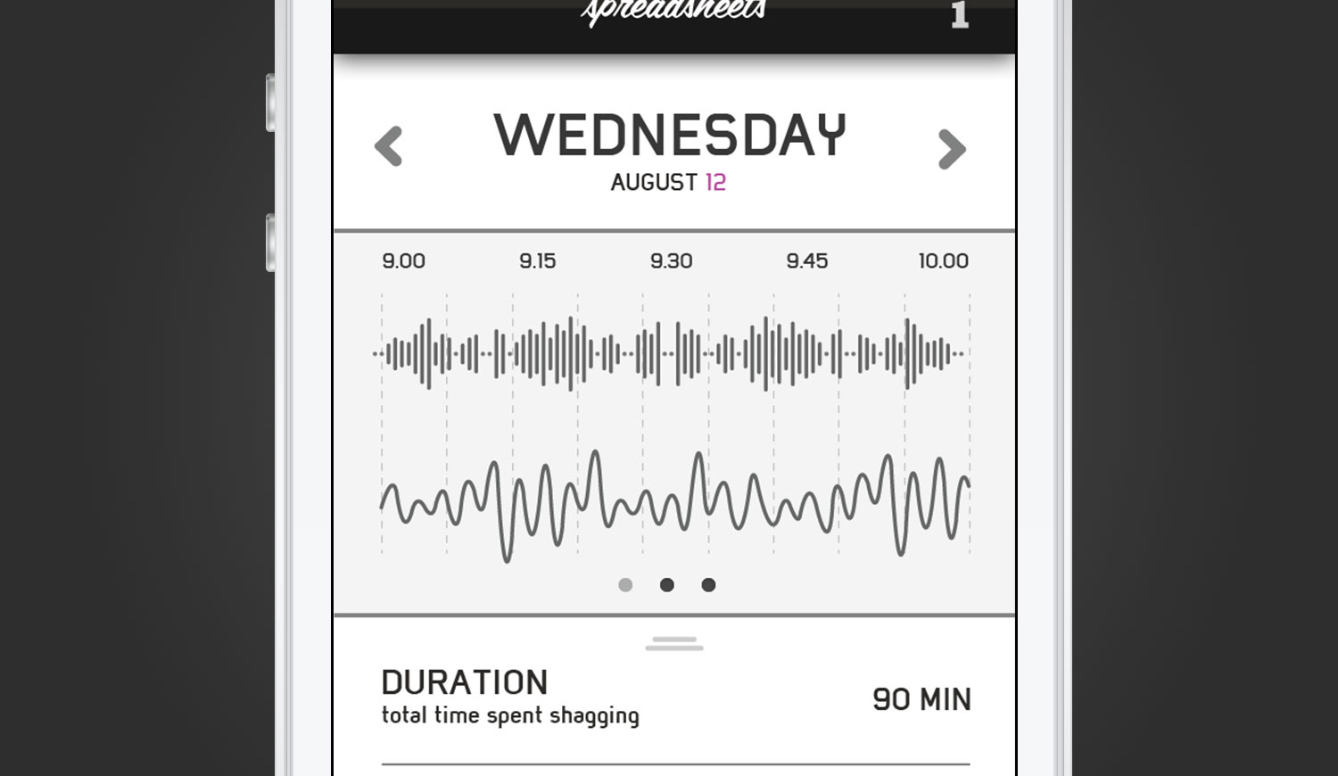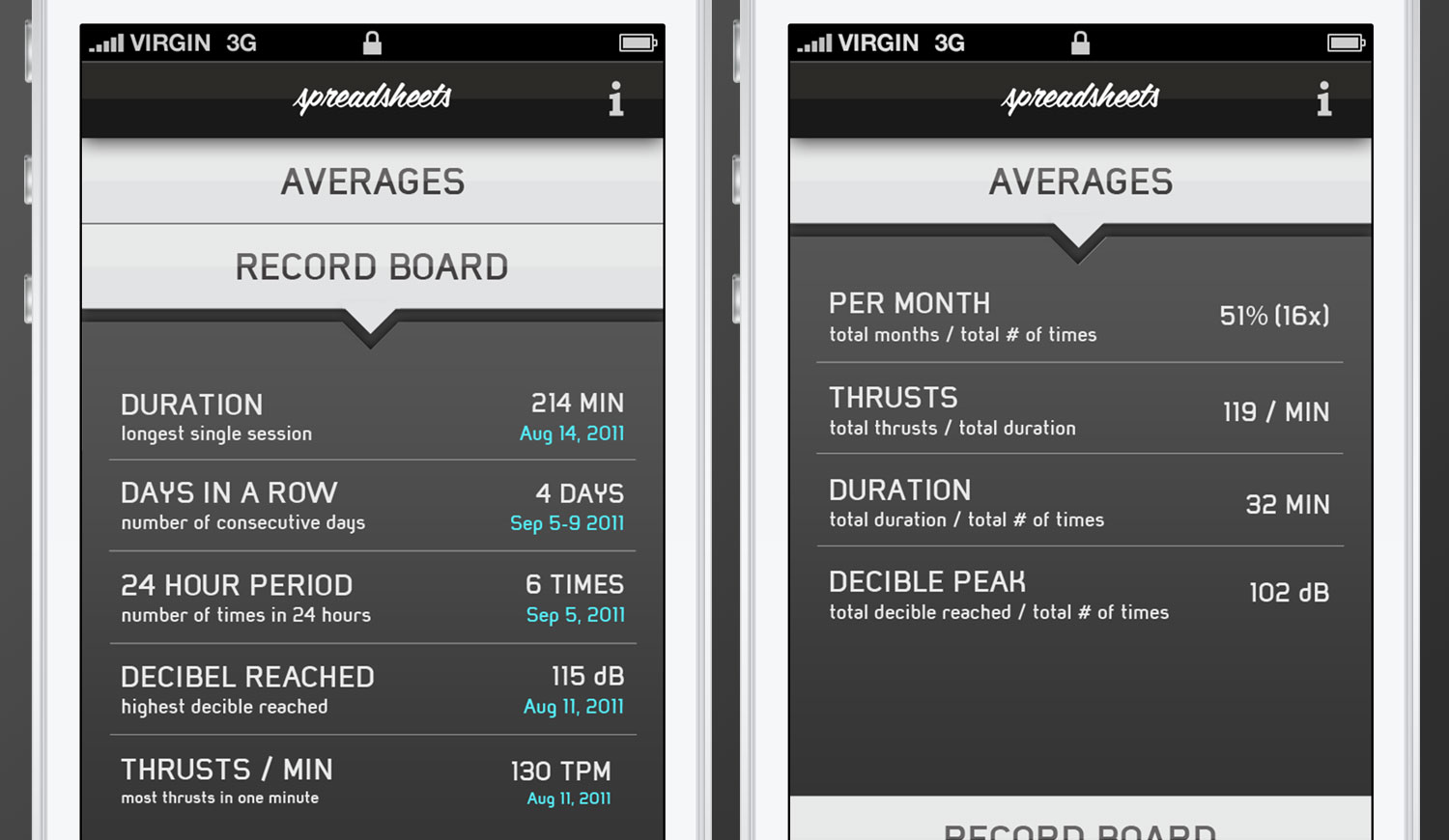 Spreadsheets app has been downloaded over 600,000 times across the globe and has made local news in Colorado (where I'm from). It's essentially real-time data about your sex life. If this isn't your kind of humor, or sex talk makes you uncomfortable, click the back button now. For those amused and curious to know: "just what kind of data are we talking about?" -- Think: thrusts per minute and average duration to start. I had a hand in the promotional video at the end, and created all of the UX & concept for the first version shown here.